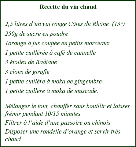 A défaut de venir au chalet, une idée de faire votre vin chaud (je vous remets la recette) à la maison. A déguster bien confortablement installés au chaud en attendant l’année prochaine…..