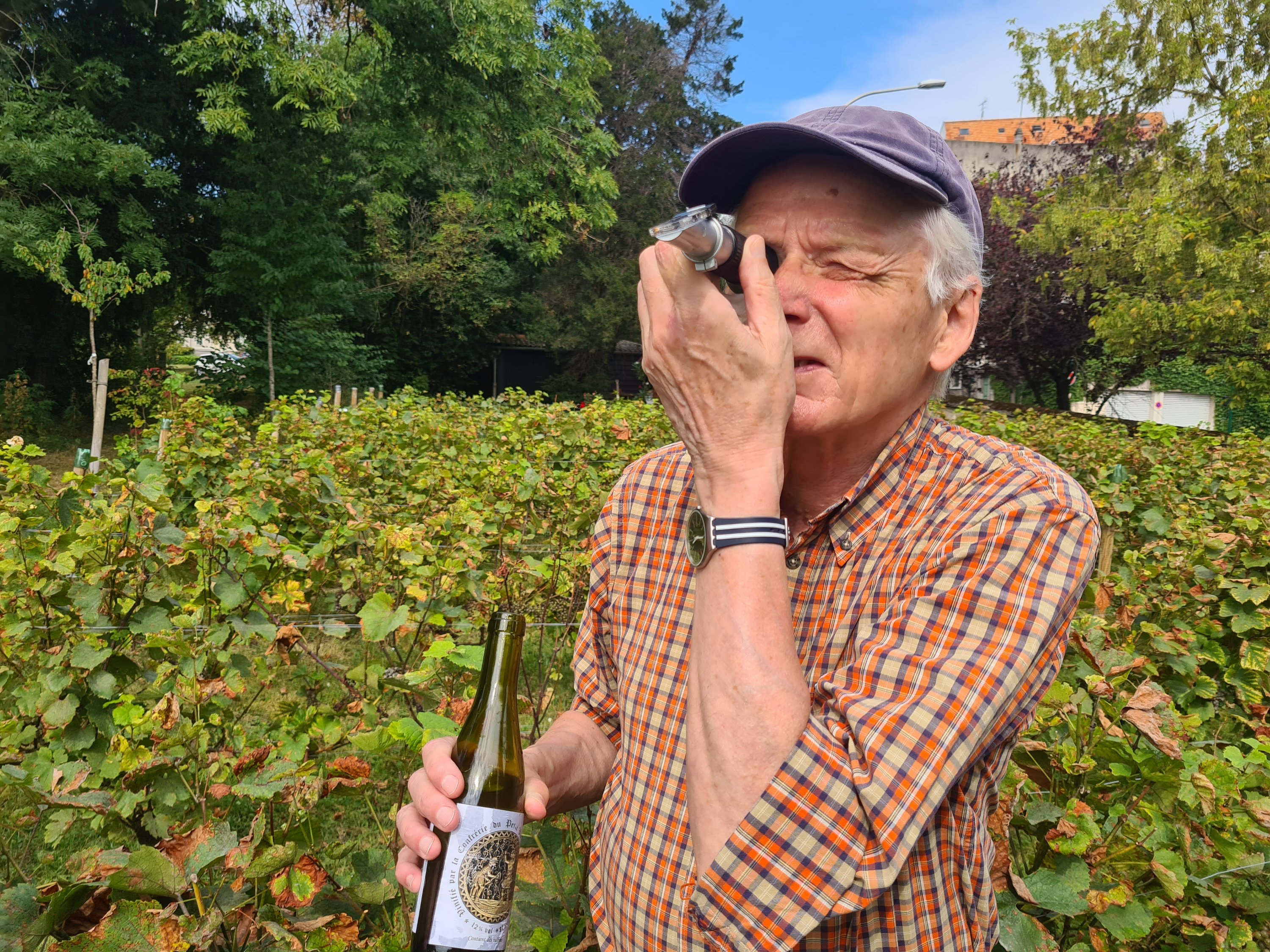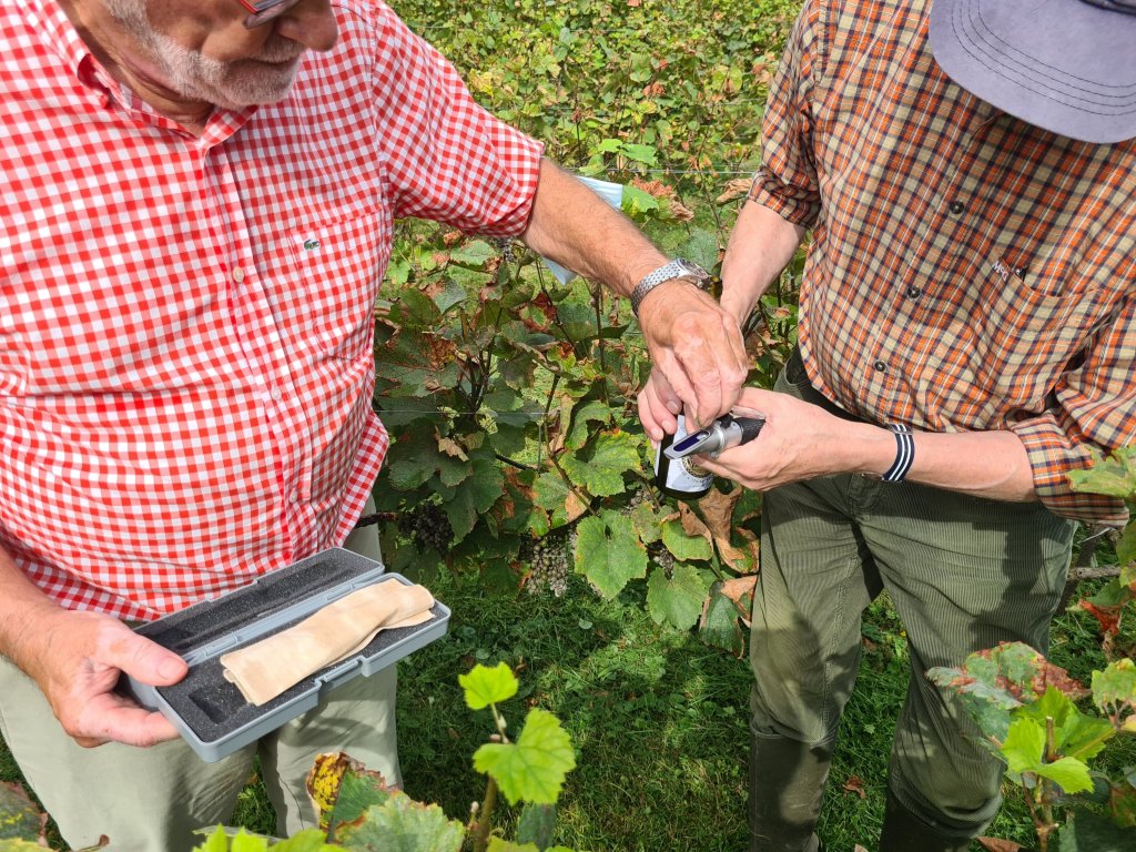 Eric et Daniel ont hier fait une évaluation du potentiel que pourrait nous livrer la vigne au moment des vendanges à l’aide d’un refractomètre.