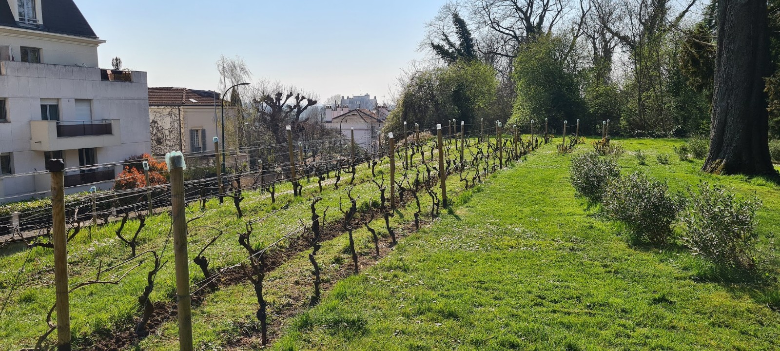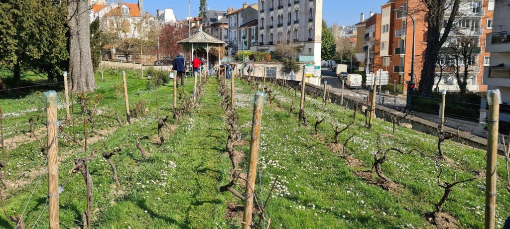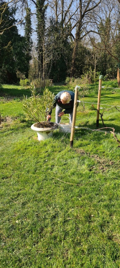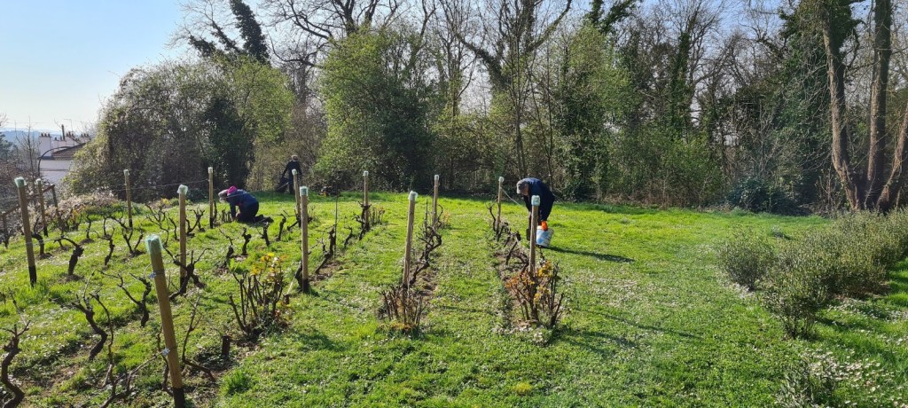 La joyeuse équipe continue le travail d’entretien de la vigne sous un joli soleil, mais un vent capricieux : desherbage manuel ou avec bêche, tondeuse, rotofil… Tout est bon !
