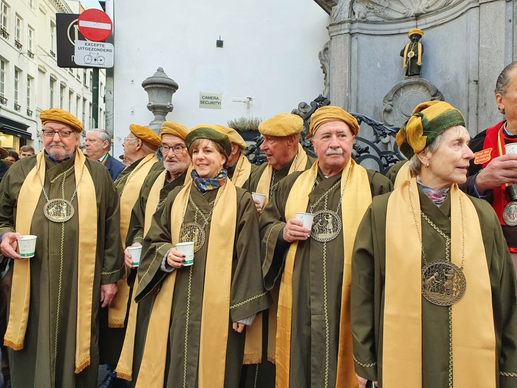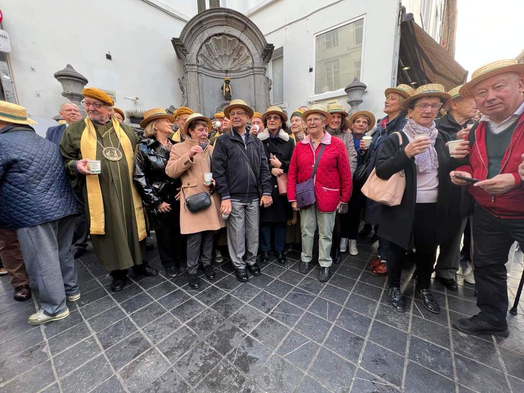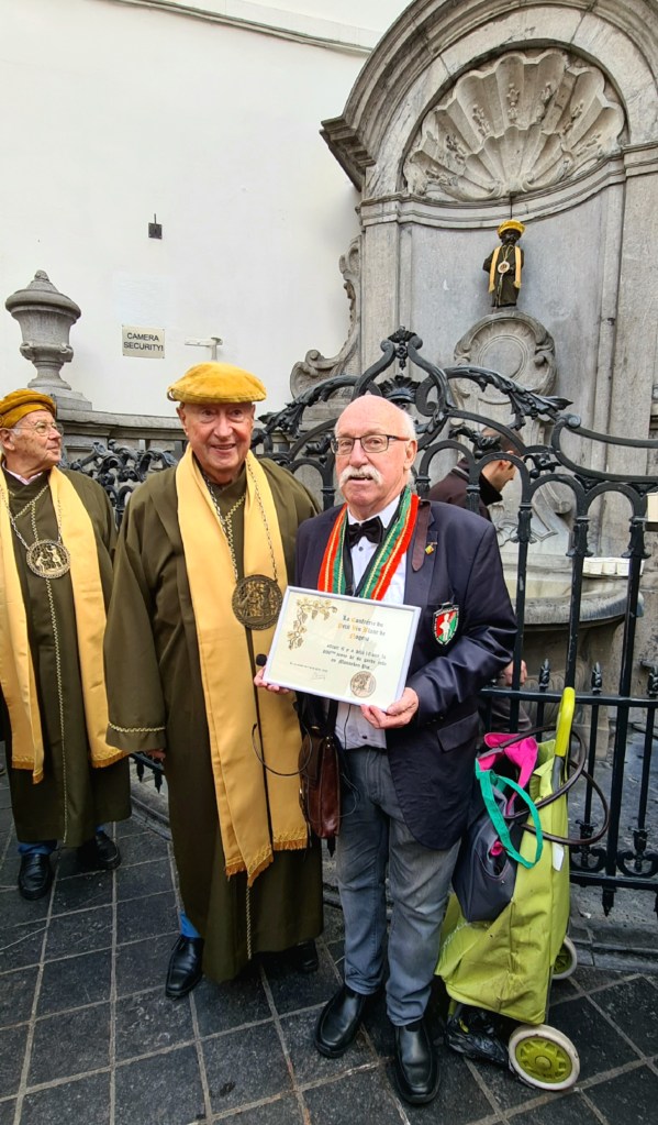 Arrivés à Bruxelles, nous avons tout d’abord fêté l’anniversaire de la remise de notre robe au Petit Julien, plus connu encore sous le nom du Manneken Pis. C’est en effet le 27 octobre 2012 que nous lui avions offert, avec tout le protocole et le cérémonial voulu, son 896ème costume. Nous avons été accueillis devant la statue par les Amis du Grand Ordre du Manneken Pis et quelques représentants amis de la Confrérie des Maitres Brasseurs et Distillateurs de Wallonie : photos, quelques frites (excellentes) et un verre de vin blanc pour fixer à la remise de diplôme à l’Ordre du Manneken Pis pour marquer cet anniversaire. Une foule toujours aussi nombreuse venue des quatre coins du monde a emporté dans sa valise notre photo, quelle célébrité ! 😉