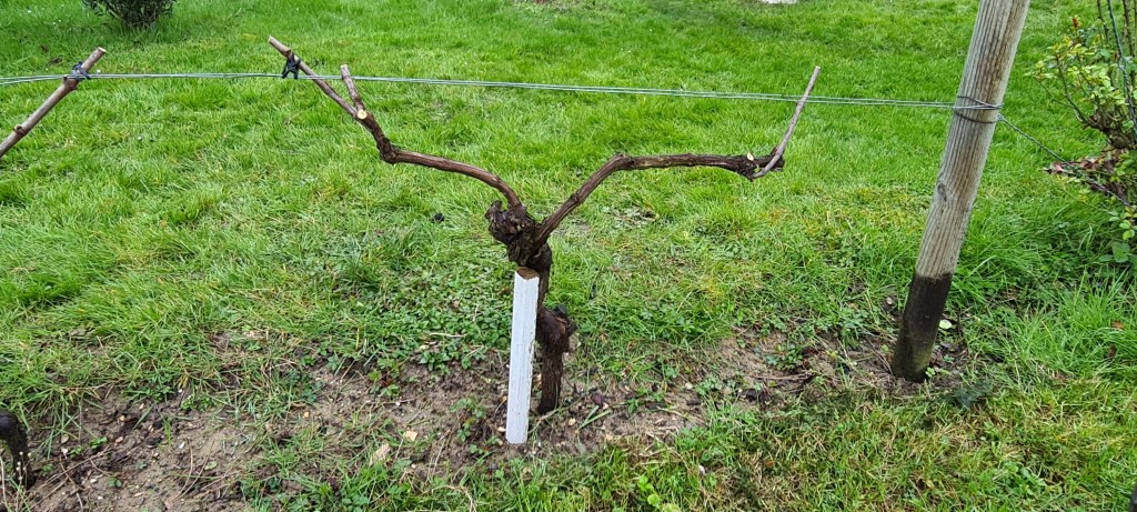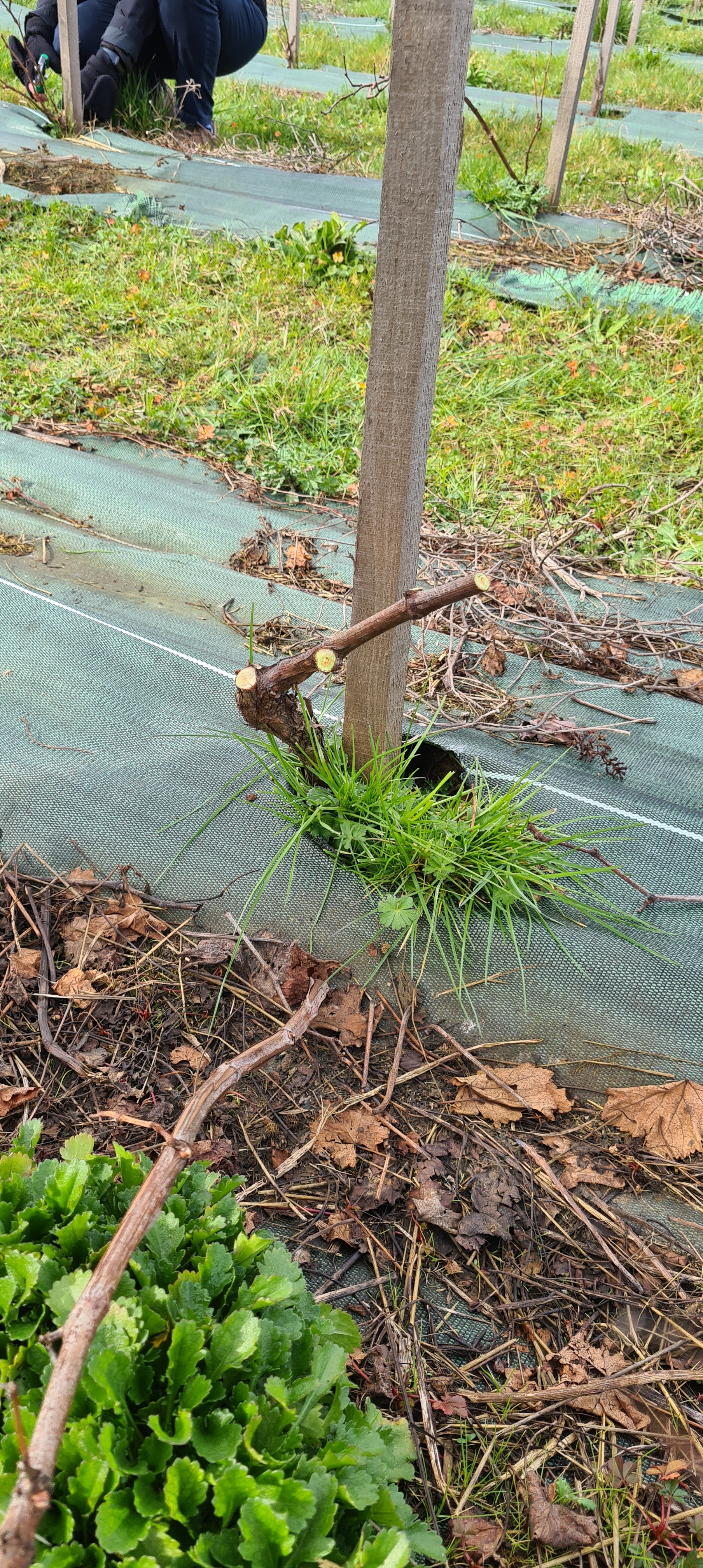 Les conseils prodigués ont été mis à profit dès le lendemain dans notre vigne. Nous avons ainsi procédé sur une journée à sa taille annuelle, activité essentielle qui influence non seulement la santé de la plante mais également la qualité et la quantité de notre future récolte. Dès le départ, la Confrérie a choisi de procéder à une taille en Guyot et plus précisement en Guyot double. Le pied de vigne est ainsi structuré avec deux bras portant chacun un courson et une baguette. Cette taille permet un bon rendement et une répartition de la charge homogène.