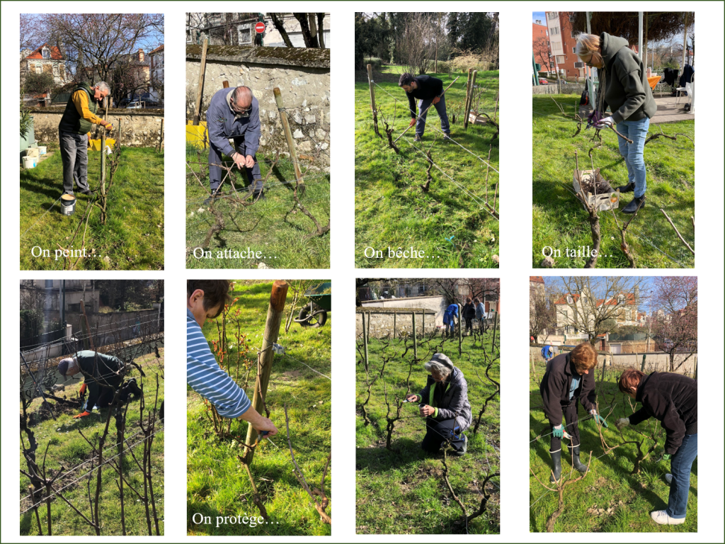 Emma nous raconte le déroulement des activités sur la vigne en cette journée du 8 mars. » Cette première grosse matinée a été consacrée au tri et rangement de la cabane, au nettoyage et à la taille de la vigne sous la houlette de Jean-Pierre. Les pieux ont été badigeonnés d’un produit pour les protéger des intempéries. Les tiges vaillantes ont été liées au fil de soutien afin de respecter la forme de la taille. Du mastic a été déposé sur les plus grosses coupes afin de protéger le bois. »